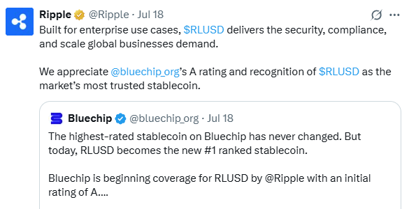 On July 18, 2025, RLUSD by Ripple surged to the top of Bluechip’s stablecoin rankings, earning an initial “A” rating and claiming the number 1 spot for safety and reliability. Known for its dollar-backed structure and regulatory transparency, RLUSD’s ascent marks a major leap in financial trust.