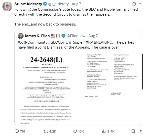 Adding to the momentum, Ripple and the SEC jointly filed to dismiss their long-standing legal appeals, officially ending the high-profile case. James K. Filan of Filan Law broke the news, with Ripple’s Chief Legal Officer Stuart Alderoty confirming: “The end… and now back to business.”