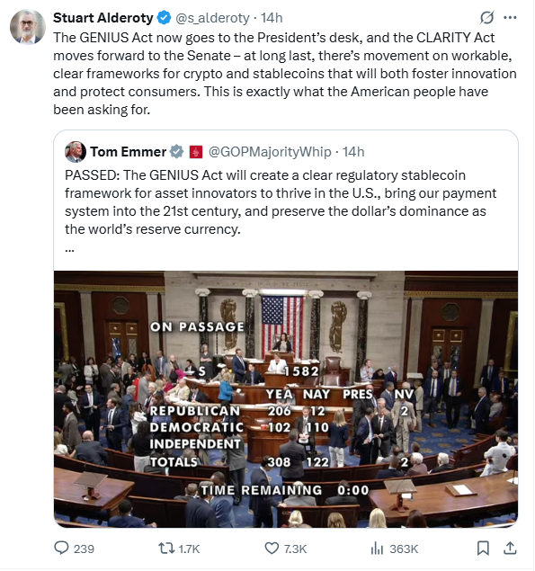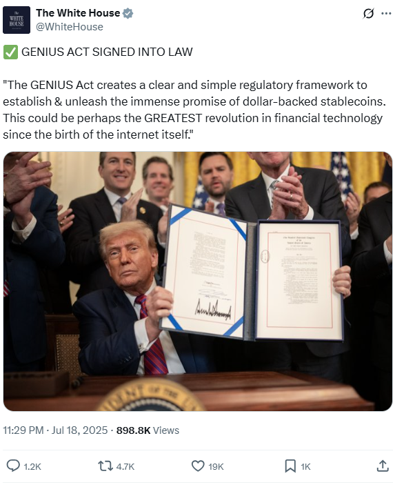 This announcement arrived just as President Trump signed the GENIUS Act into law—hailed as a transformative move for crypto innovation. Following the Financial Services GOP’s approval of the Clarity, Genius.1582, and Anti-CBDC Surveillance State Acts, the GENIUS Act introduces a clear framework designed to unleash the full potential of dollar-backed stablecoins.